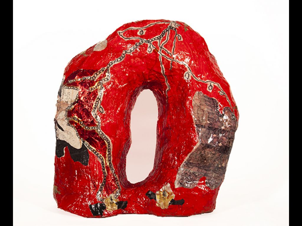 pasta de papel reciclado, estrutura de arame galvanizado soldada com estanho, massa corrida, acrílica, grafite sobre papel, papéis laminados metalizados, laca cristal e resina epóxi
