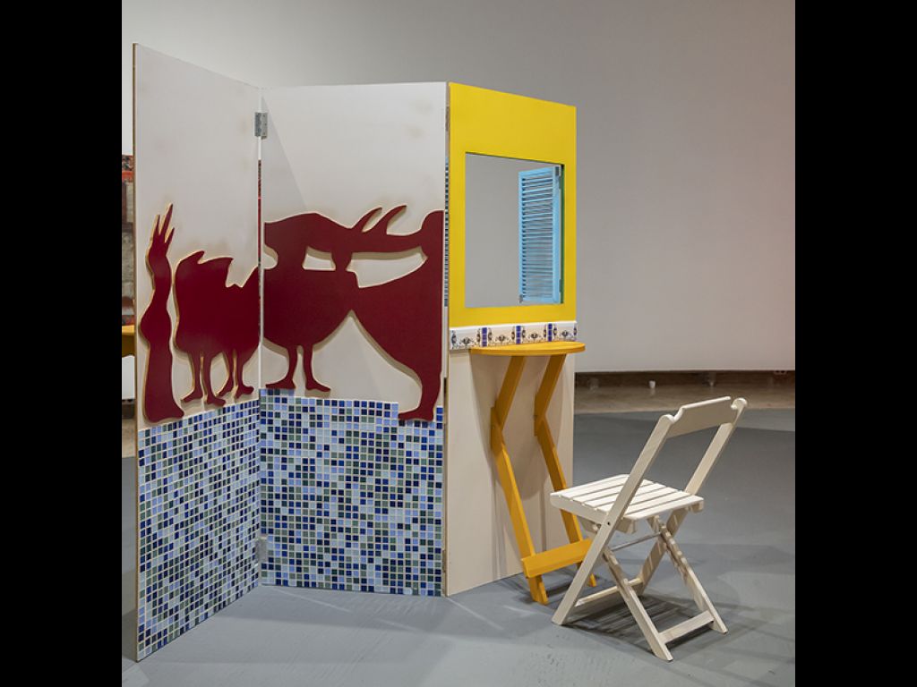 Técnica/Suporte/Materiais: madeira (MDF e pinus), tinta (acrílica, de parede e esmalte sintético), ferragens, pastilhas de vidro, azulejos, xícaras, cinzeiro, tecido, fios de sisal, cadeira, garrafas e copo de vidro